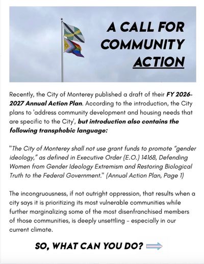 The Monterey Peninsula Pride Center recently sounded the alarm on their Instagram that the City of Monterey is incorporating blatant transphobia into their Annual Action Plan, citing an Executive Order as justification. Executive Orders are NOT law, there is no legal obligation for the City of Monterey to comply with it. We can not let them perpetuate this violence under the guise of lawfulness, call them out for what it is: rolling over for a fascistic regime instead of standing up for vulnerable community members.